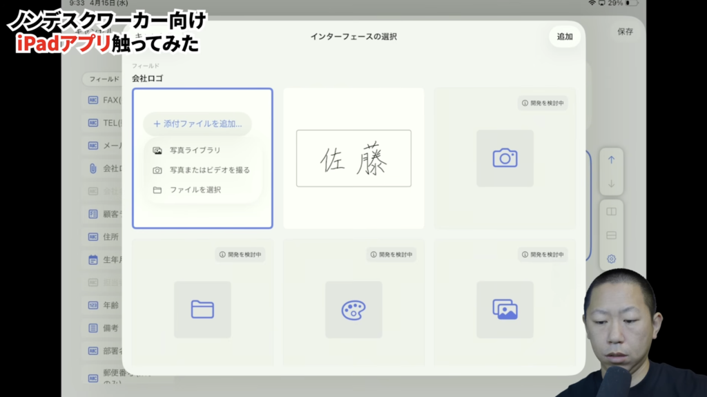 iPadアプリを立ち上げると、kintone上のどのアプリをiPad専用画面で表示するかを選択できます。ここで、フィールドごとに「どんな見た目で入力させるか」を個別に設定していきます。